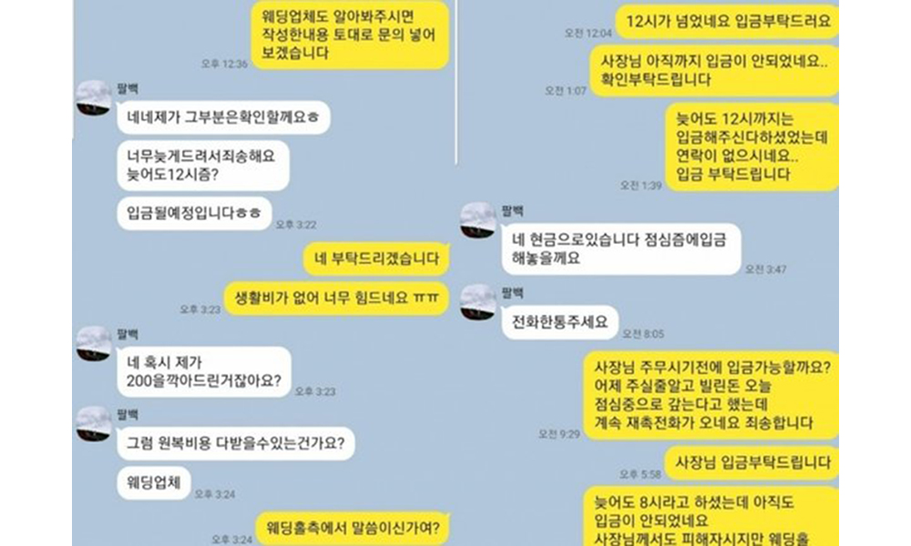 주말에 웨딩홀에서 일하다 실수로 손님에게 음식을 엎질러 800만원을 날리게 된 아르바이트 직원의 사연이 온라인 커뮤니티에 올라왔다. 온라인 커뮤니티에는 '웨딩홀 단기 알바 갔다가 800만원 잃었습니다'라는 제목의 글이 올라왔다. 아르바이트 직원의 형제라고 밝힌 작성자 A씨는 "몇주 전 주말 동생이 웨딩홀 단기 알바를 하다가 손님께 음식을 엎었다"고 전했다. 그는 "당시 일하고 있던 와중에, 손님이 손목을 잡고 중고 명품점을 가서 진품 여부와 세탁비가 어느정도 나올 것 같다는 견적을 받아 1000만원을 요구했다"며 "동생이 그 자리에서 무릎 꿇고 빌어서 800만원으로 합의를 봤다"고 했다. 그러면서 "웨딩홀 측에서는 근무지 이탈로 당일 일당도 안 주었고, 손님과도 알아서 합의 보라는 식의 입장이었다"며 "..