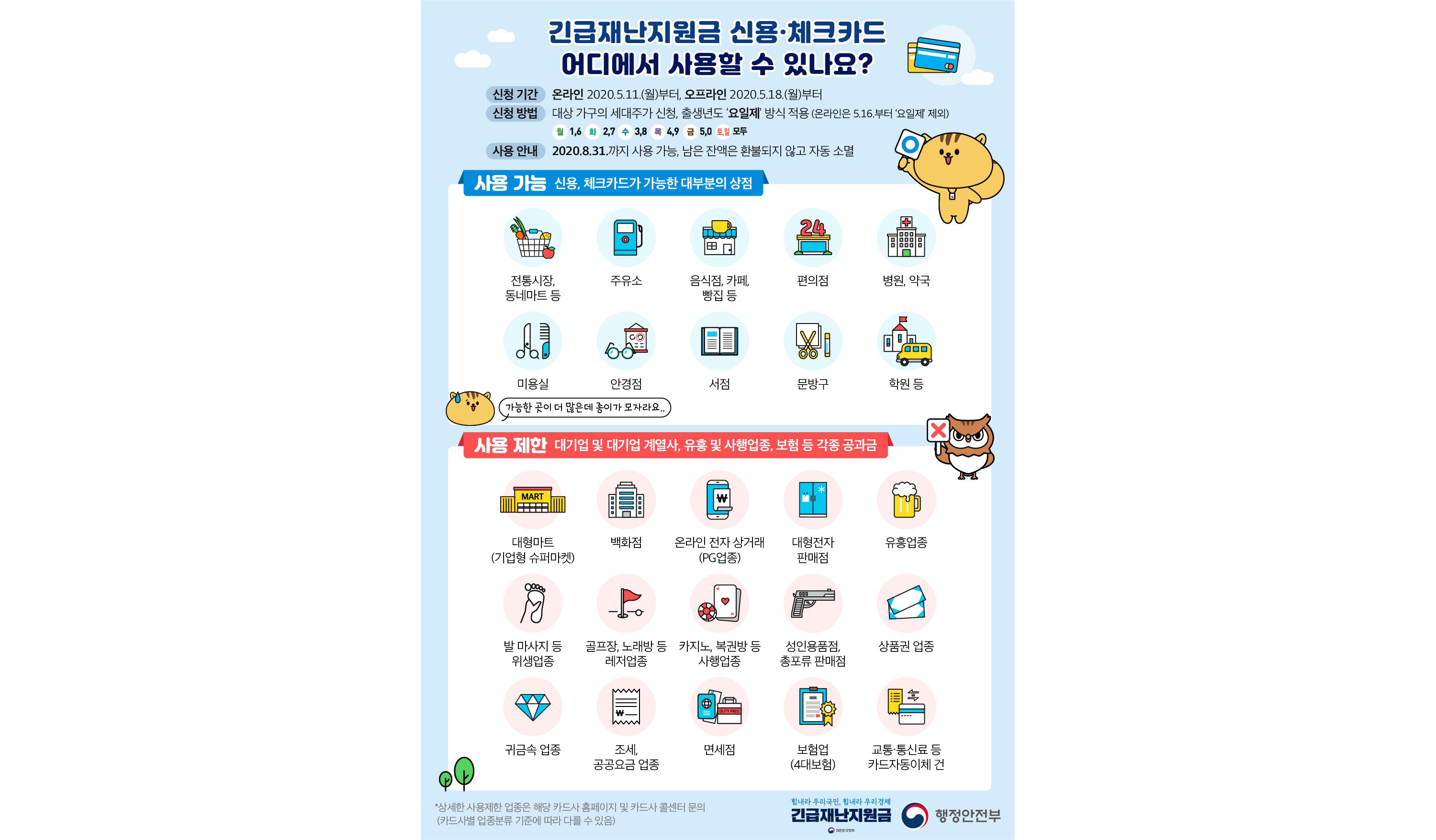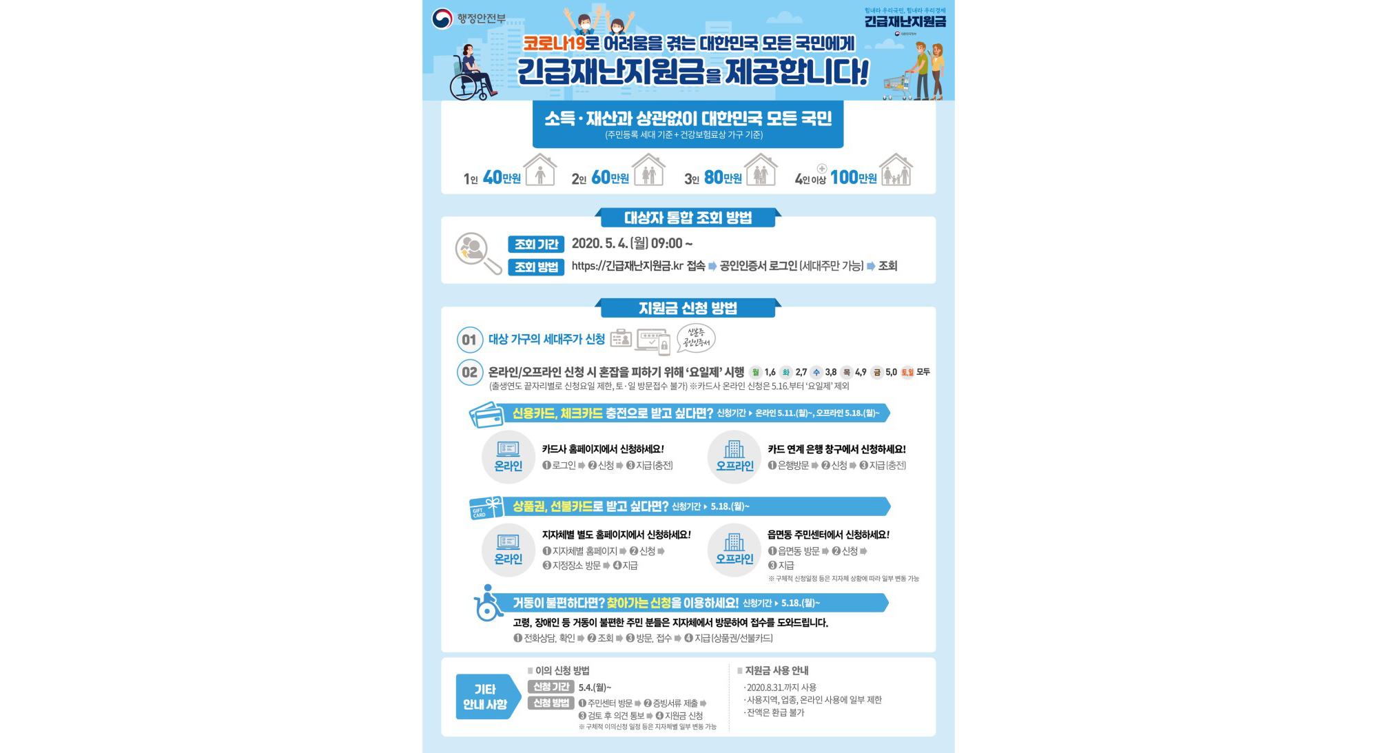오늘 오전 7시부터 신용·체크카드를 통한 정부 긴급재난지원금 신청 접수가 시작됐다. 단 신청자 분산을 위해 이번주(11~15일)엔 출생 연도 끝자리에 따라 요일별로 월(1,6)·화(2,7)·수(3,8)·목(4,9)·금(5,0) 신청할 수 있다. 16일 토요일부턴 요일제가 사라져 누구나 24시간(23:30~00:30은 점검) 신청할 수 있다. 재난지원금 신청·안내와 관련한 인터넷주소(url) 링크를 문자·이메일로 받았다면 사기일 가능성이 높다. 카드사는 스미싱·파밍 등의 사기를 막기 위해 url 링크는 보내지 않기로 했기 때문이다. 카드로 지급 신청을 하기 전 마지막으로 점검할 포인트 10가지를 정리했다. Q1. 어디에서 신청하나? 재난지원금 지급 신청이 가능한 카드사는 신한·KB국민· 삼성·현대·우리·롯..