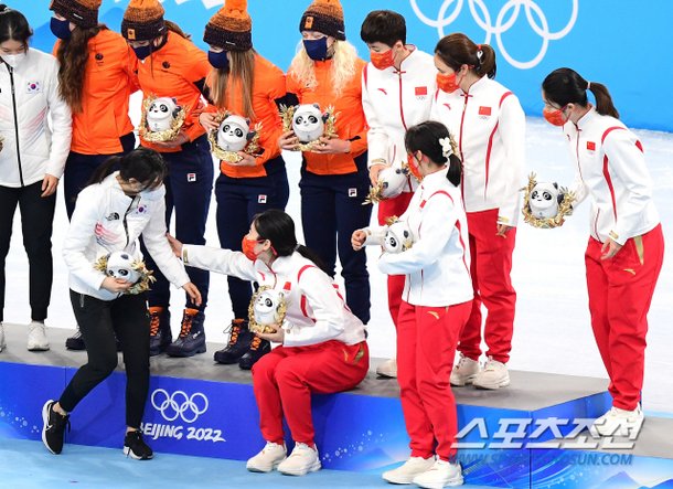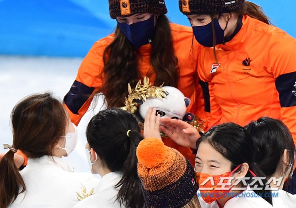 쇼트트랙 스피드스케이팅 여자 3000m 계주 시상식이 열렸습니다. 메달 세리머니가 아닌 올림픽 마스코트 빙둔둔을 수여하는 자리. 1위를 차지한 네덜란드, 2위 한국, 3위 중국의 선수들이 시상대에 함께 올랐습니다.
