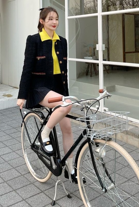 공개된 사진 속 강민경은 블랙 재킷에 노란색 니트를 입고 아찔한 초미니를 입은 채 자전거를 타고 있는 모습입니다.