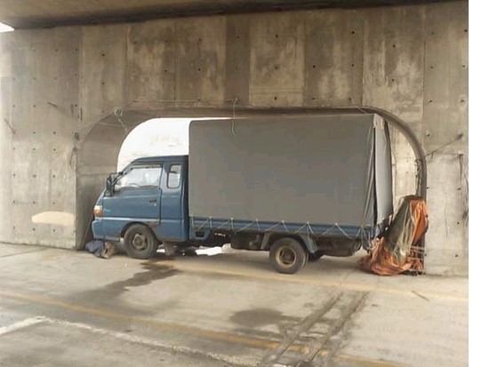 사진 속 SUV 및 승합차, 트럭 등의 뒷바퀴가 옹벽 끝에 아슬아슬하게 걸쳐져 있는데요.