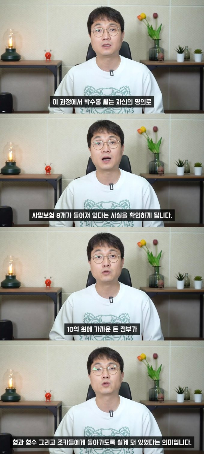 그는 박수홍 앞으로 박수홍이 모르는 사망보험만 8개가 가입이 되어있으며 10억원에 달하는 사망보험금의 수혜자는 친형 부부라는 주장을 하였습니다.