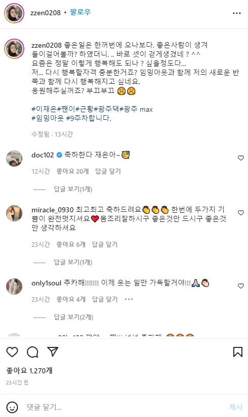 또 "저 다시 행복할 자격 충분한 거죠? 임밍아웃과 함께 저의 새로운 반쪽과 함께 다시 행복해지고 싶네요. 응원해주실 거죠? "라고 밝혔습니다.