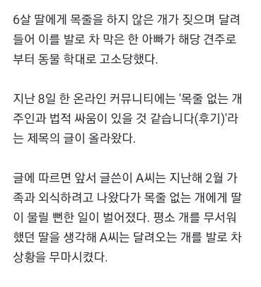 글쓴이의 주장에 따르면 자신의 6살 난 딸에게 목줄을 하지 않은 개가 짖으며 달려들어 이를 발로 차 막자 견주로 부터 동물 학대로 고소를 당했다는 내용이었습니다.