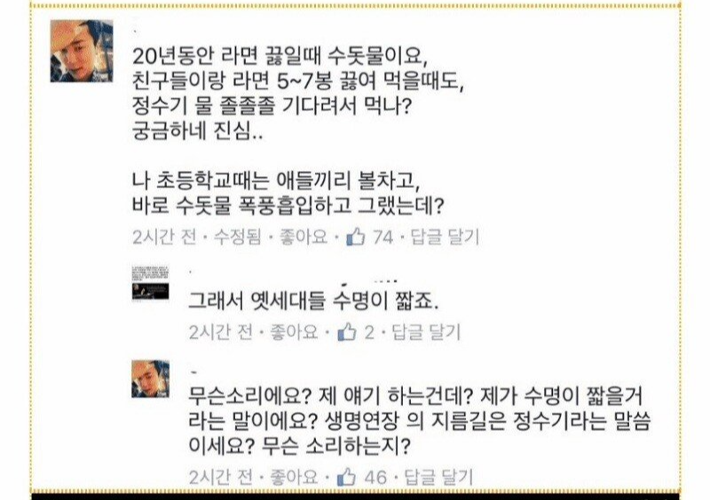 누리꾼들은 "난 무조건 정수기, 물 냄새에 민감한 편이라..수돗물 그 특유의 냄새가 있어", "나는 정수기 뜨거운물 빨리 끓는거 최고", "수돗물 다 팔팔 끓여서 하는건데 뭐", "자취하는데 집에 정수기 없어서 다 수돗물로 함.. 물 자체를 끓이지 않고 먹는 물냉면 같은거 만들때는 생수", "생수쓰는게 좋긴한데 귀찮아서 그냥 수돗물", "집에서 먹는건 다 생수", "국물있는건 정수기", "국물 없는건 수돗물", "끓이거나 열 가하면 수돗물 아니면 생수" 등 갑론을박을 벌이며 다양한 의견을 제시하였습니다.