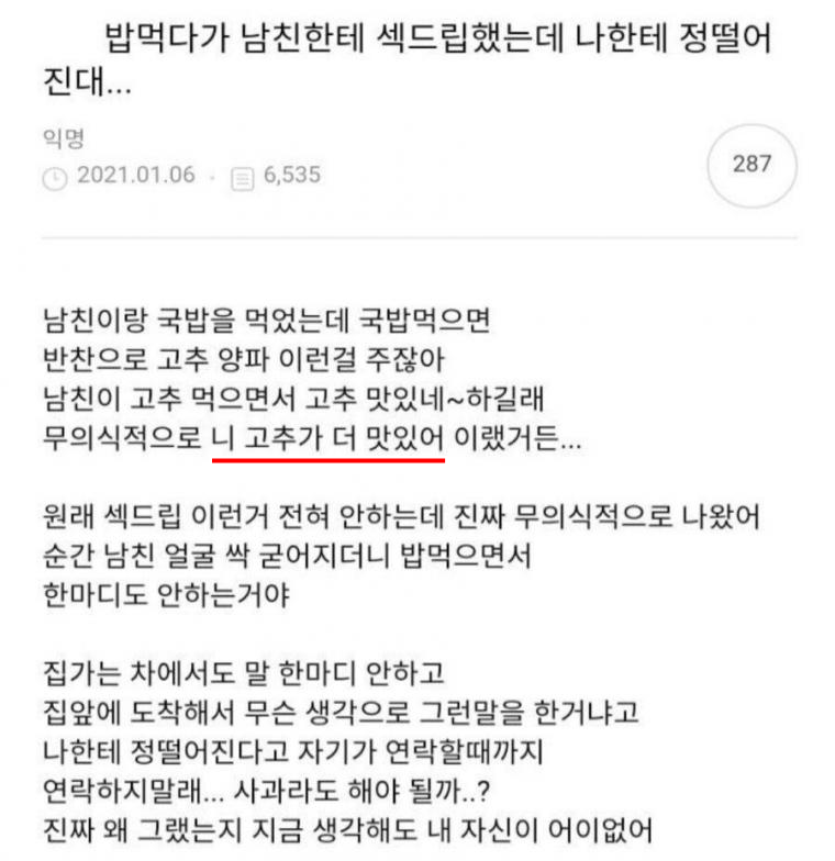 이 여성은 자신이 남자친구와 밥을 먹다 자기도 몰래 섹드립을 했다고 하는데요.