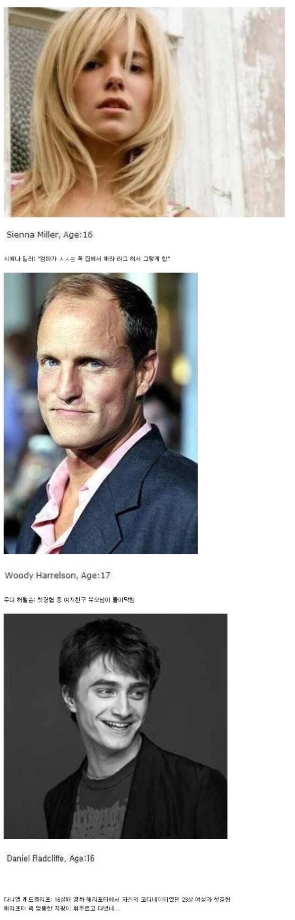 오늘은 헐리웃 배우들이 밝힌 자신의 첫경험 나이에 대해 알아보겠습니다.