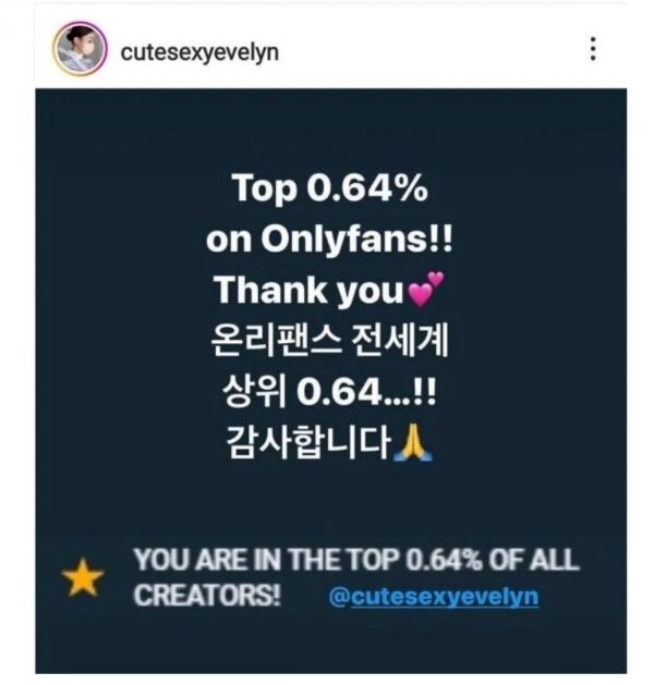이블린은 구독자들의 자금을 받고 크리에이터들이 특정 유료 콘텐츠를 제공하는 사이트인 온리팬스에서 상위 1% 안에 들었다고 전했는데요. 콘텐츠 제작자가 본인 계정에 사진이나 동영상 같은 콘텐츠를 올리고 보길 원하는 사용자가 유료 구독을 결제하면 해당 내용을 볼 수 있으며 음란물 등의 사진 및 동영상이 올라오는 것으로 알려졌습니다.