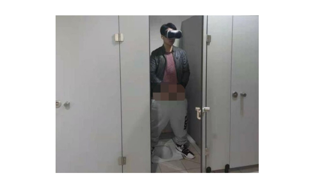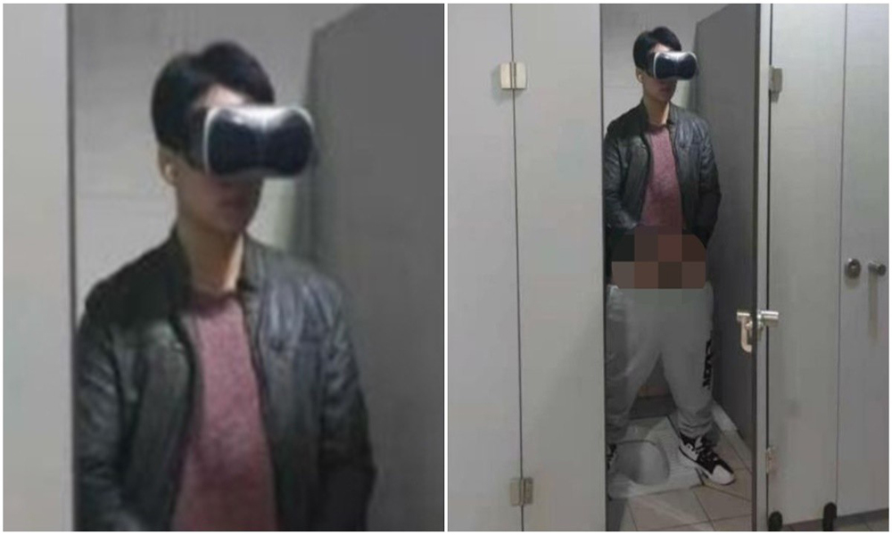 사진 속 이 남학생은 화장실에서 VR 기기를 쓴 채 바지를 반쯤 벗고 음란 행위를 하고 있었다.