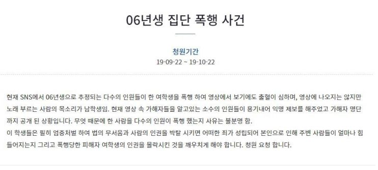 22일 청와대 국민청원 게시판에는 '06년생 집단 폭행 사건'이라는 제목의 청원 글이 올라왔다.