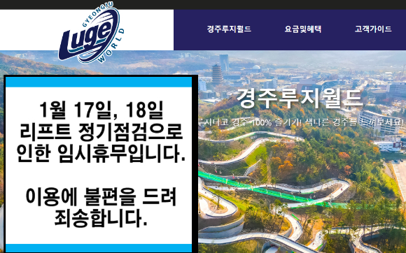 경주루지월드는 이날 홈페이지에 "17일,18일 리프트 정기점검으로 인한 임시휴무"를 공지하였습니다.