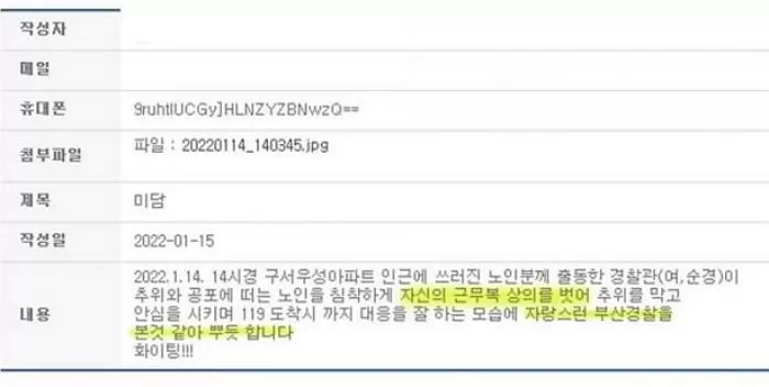 최근 부산경찰서 공식 페이스북 '부산경찰'에는 지난 15일 금정경찰서 '서장에게 바란다' 게시판에 올라온 한 미담 사연이 게제됐습니다.