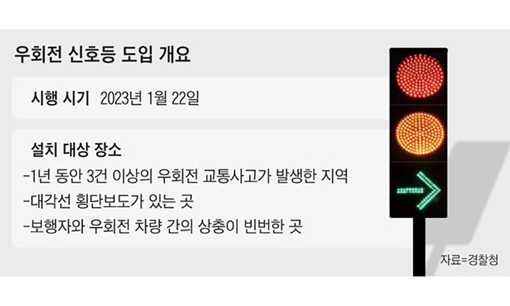 앞서 2016년 서울경찰청은 서울 시내 54개 지점에 우회전 전용 신호등 확충을 추진했지만 경찰청은 별도의 법적 근거가 없다는 이유로 이를 받아들이지 않았다. 경찰 관계자는 “교통사고가 잇따르는 복잡한 교차로를 중심으로 우회전 신호등 도입이 필요하다는 목소리가 있어왔고 이번에 법적 근거가 마련된 것”이라고 설명했다.