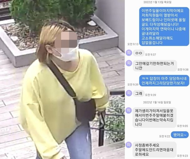끝으로 A씨는 지난달 13일과 16일에 손님과 나눈 메시지도 공개하면서 "이 손님 아시는 분은 제보 부탁한다. 아는 게 이름과 전화번호밖에 없어서 내용증명도 못 보내고 있다"고 덧붙였다.